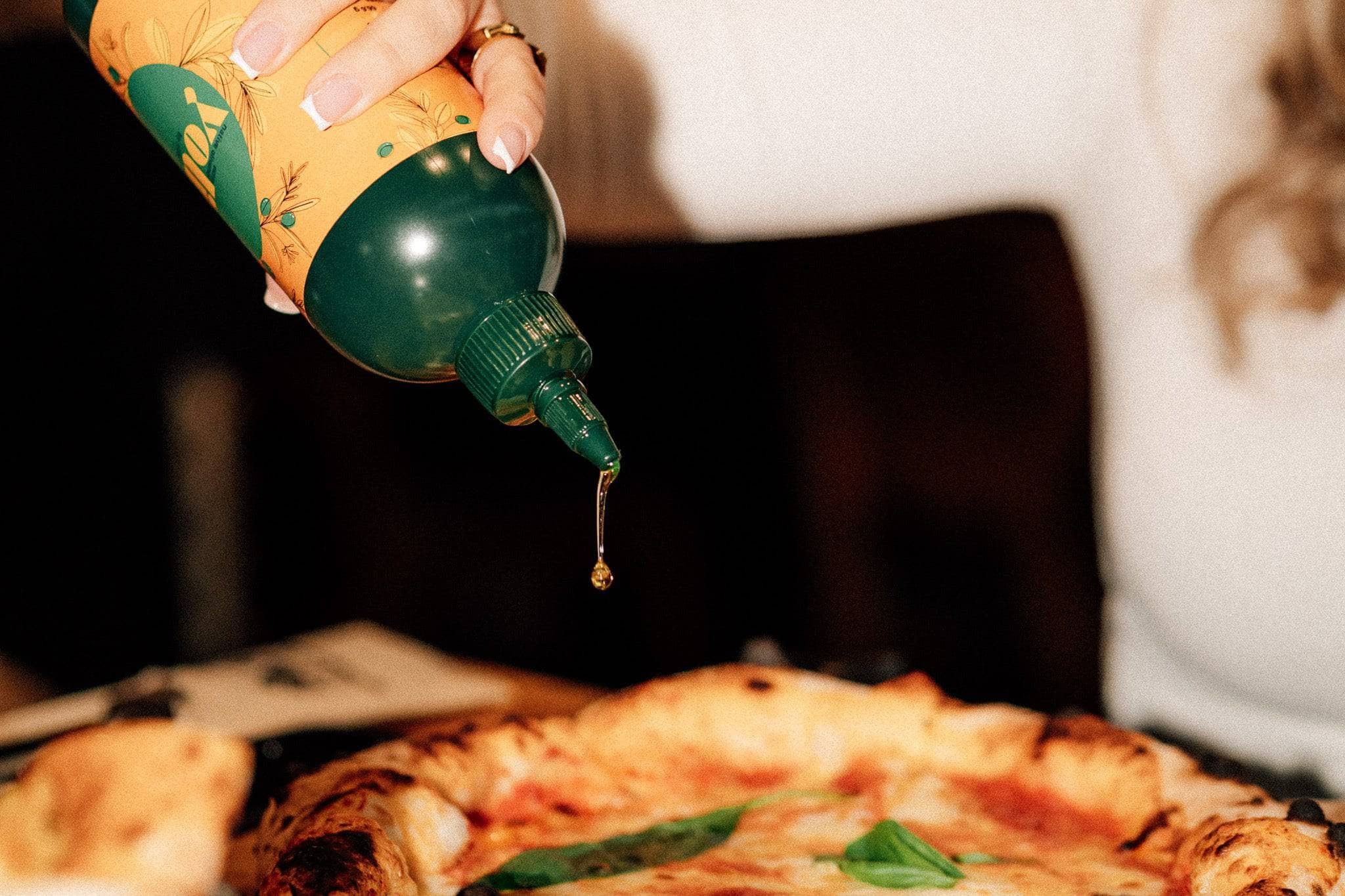 Köche verwenden in ihren Küchen schon seit geraumer Zeit sogenannte "squeeze tubes" und wir glauben, dass sich das Leben in der Küche viel angenehmer gestaltet, wenn man sie ausgiebig auspresst. Unsere Flaschen bestehen aus Post-Consumer-Kunststoffen und sind zu 100 % recycelbar. Es kommt immer die gleiche Menge heraus, man muss keinen Daumen vor die Öffnung halten wie bei traditionellen Olivenölflaschen und der quietschende Deckel ist auch Geschichte.